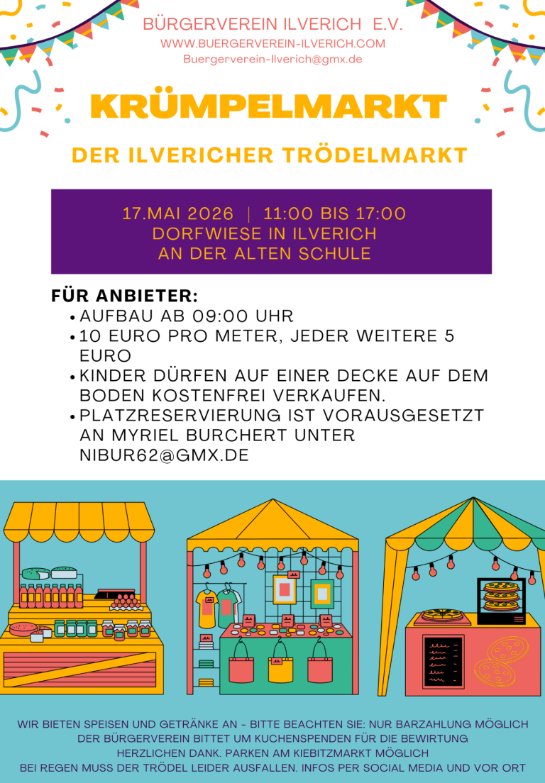 Es ist so weit – der Krümpelmarkt, der in den 70‘ern und 80’ern in Ilverich eine große Tradition hatte, wird wiederbelebt und verspricht ein tolles Event für alle Besucher. Am 17.Mai 2026 von 11 Uhr bis 17 Uhr kann man sich auf eine Reise durch die Welt des Trödels und der Schätze begeben, die man nirgendwo anders finden würde. Organisiert vom Bürgerverein Iverich e.V., bietet der Markt zahlreiche Stände mit einer großen Auswahl an alten oder einzigartigen Gegenständen, Kleidungsstücken und vielem mehr. Für das kulinarische Wohl wird mit Kuchen, Grillwürstchen und Getränken gesorgt. Wenn Sie auf der Suche nach dem Besonderen und Einzigartigen sind, sollten Sie dieses Event auf keinen Fall verpassen. Kommen Sie vorbei und lassen Sie sich von der Atmosphäre des Krümpelmarkts in Ilverich verzaubern.