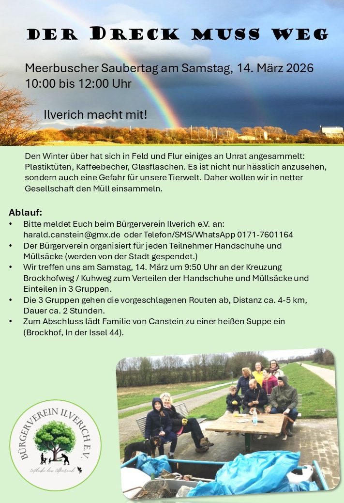 Am Samstag, den 14. März 2026, rufen wir alle Dorfbewohnerinnen und Dorfbewohner zum Saubertag in Ilverich auf! Gemeinsam möchten wir unser Dorf von Müll befreien, Grünflächen pflegen und unsere Umgebung wieder richtig schön machen.